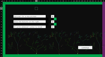 Kryptogamen is a poetry incubator, workshop, laboratory. Made in Excel, the game invites players to create a poem. Prompts are available but optional. As players move between sheets or "rooms," the previous room disappears. This is not a game for second guessing. Once the “continue” button is pressed, a player commits to moving forward.