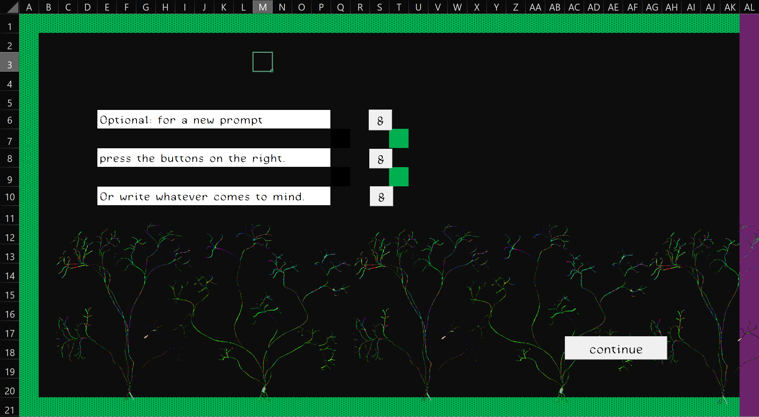 The name comes from a now deprecated classification (Cryptogamae) for algae, spores, slime molds and other plants and plant-like organisms that exhibit “hidden reproduction,” typically via spores, not seeds. Kryptogamen embraces the idea of an unruly, unconventional poetic process, harnessing the affordances of Excel to encourage players to write without restraints and self-judgment. Once they reach the end and close the document, the poem disappears, renewing the creative process.